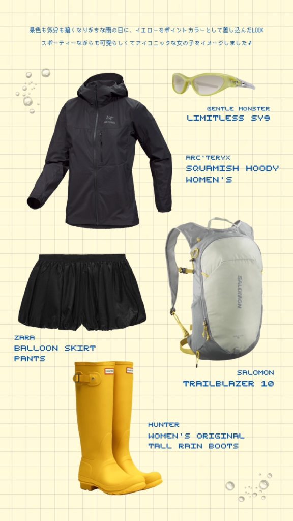 2025.06.21 COLUMN My ideal outfit on a rainy day arcofcol0218@gmail.com Rainy Days, Lovely Waysしとしとと雨が降り続き、空気まで湿り気を帯びる6月。ちょっと憂うつになりがちなこの季節だけど、私たちが見つけたいのは、そんな天気さえ楽しみに変えてくれる“理想のルック”。「今はまだ憧れ。でも、いつかはきっと手に入れたい」——そんな夢を乗せたアイテムたちを、部員がそれぞれの視点でセレクトしました。雨粒がきらめく窓辺にも、傘を片手に歩く道にも似合う、とっておきのスタイルを。梅雨だからこそ纏いたい色、素材、シルエット。少しだけ背伸びして、いつもの自分よりすこし特別な気分で。今の季節を、もっと好きになるためのファッションです。 [Yuhi’s look]Urban Utility — 雨に映えるモードの選択肢湿度を含んだ空気に包まれる季節。そんな6月にこそ映えるのは、機能と洗練が共存するスタイル。メインピースは、PRADA 2024年春夏コレクションのルック11から着想を得たマルチポケットベスト。特徴的なディテールと軽やかな構造が、実用性とミリタリーテイストを絶妙に融合させる。アウトドア的な要素を宿しながらも、都市生活に違和感なく溶け込む、存在感ある一着だ。インナーにはVALENTINO 2023SSから、シャープな白シャツと構築的なグレーのショートスラックスをセレクト。無駄を削ぎ落としたミニマルなバランスが、全体に洗練された空気をもたらす。さりげない緊張感と静けさが共存する、都会的なレイヤードが完成する。足元には、BALENCIAGAの無骨なレインブーツを。重厚なフォルムがスタイル全体を引き締め、天候に左右されない安定感を添える。全体のカラーパレットは、グレー、ブルー、ホワイトを基調に構成。静謐さと清潔感をまといながら、どこかエッジの効いた印象を残す。モードと機能性を兼ね備えたこのルックは、雨の日を単なる「悪天候」に終わらせない。都市に暮らす現代の感性が選ぶ、新しいレインスタイルのかたちだ。 [Sakura’s look]“A Hint of Yellow”―雨音に似合う、軽やかな差し色どんよりとした空模様に包まれる雨の日。景色だけでなく、なんとなく心までも曇ってしまいそうなそんな瞬間に、ふと目に飛び込んでくる“イエロー”の差し色は、まるで太陽のかけらのよう。今回のLOOKでは、そんなビタミンカラーをキーカラーに据えて、雨の日のムードを一新するスタイリングを提案。ベースは、軽やかで動きやすいスポーティーなアイテム。そこにどこか愛らしいシルエットをプラスすることで、“甘さ”と“アクティブ”の絶妙なバランスを表現。たとえば、リュックに差し込んだイエローのラインや、足元のレインブーツのアクセントカラーが、シンプルな中にも個性を感じさせてくれる。イメージしたのは、雨の街を軽やかに駆け抜ける、自由でポジティブな女の子。曇り空さえもキャンバスに変えるような、そんな存在感で、憂鬱な日常にひとさじのときめきを添えて。 アプローチは違えど、どちらもこの季節をポジティブに楽しむための答えのひとつ。湿った空気に沈みそうな気分も、お気に入りの一着があれば軽やかに動き出せる。雨の日を理由にしない。むしろ、その空模様に映えるスタイルをまとうことで、自分の一日を、自分らしく彩っていく。そんな想いを込めて提案する、私たちのレインルックです。