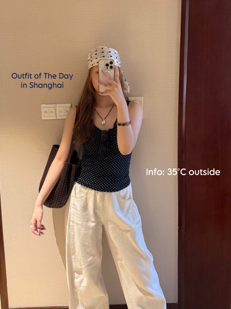 この日はとても暑くて、ノンスリーブのトップスに、流行りのドット柄バンダナを合わせてみた。
