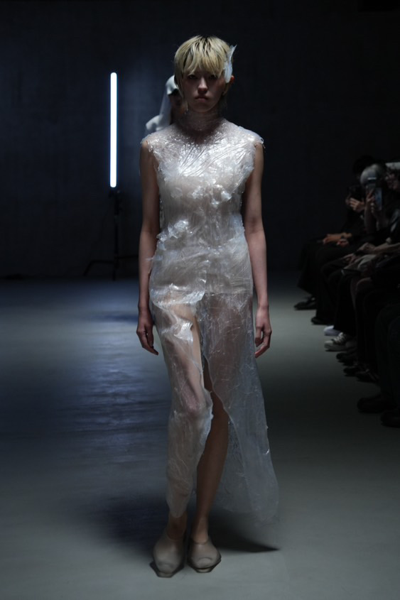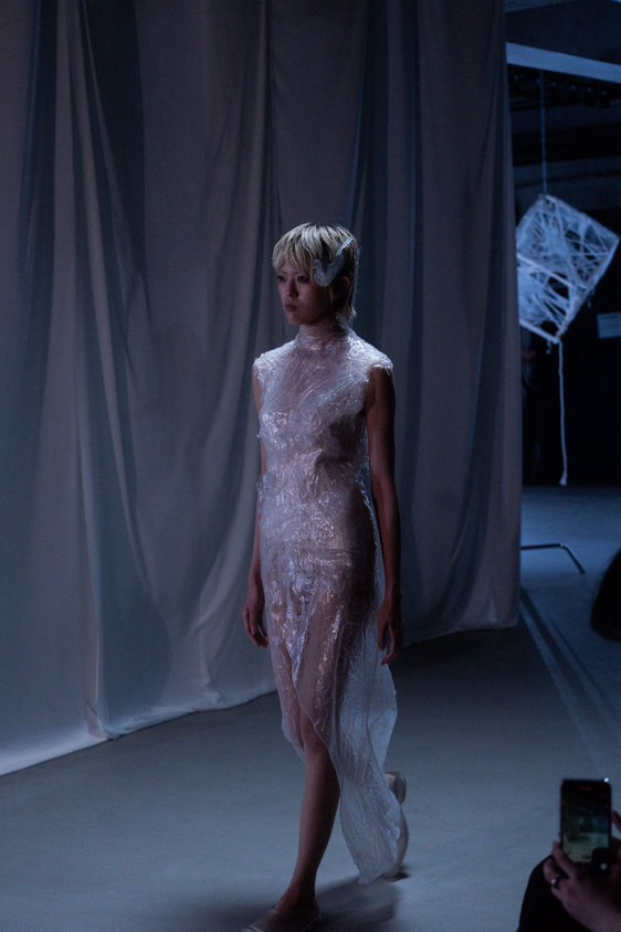 石島:ショーのテーマとは少しずれるかもしれませんが、自分が思う“美の価値観”を形にしたいと思って制作しました。冷たくて、自分が一番美しいと感じるものを作りたいと思い、ガラスや泡、水などの透明なものに無条件な美しさを感じました。そこから“透明の美しさ”をルックとして昇華できたらと思いました。