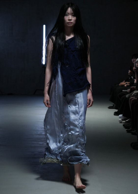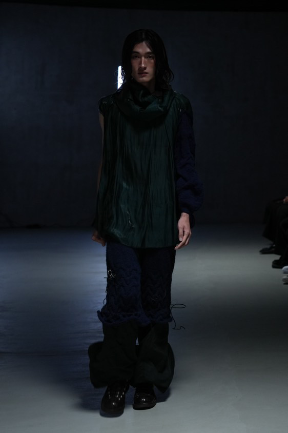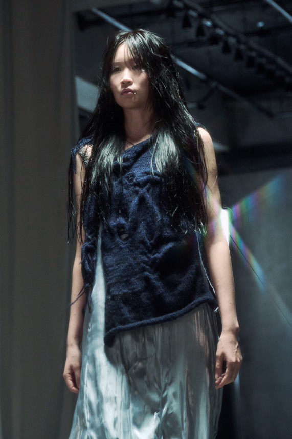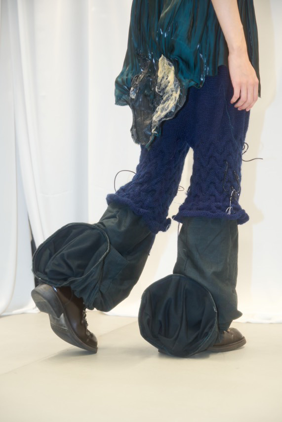 ウィメンズルック(Look28)は、ニット・ラテックス・オーガンジーで素材の組み合わせを実験しました。ニットの穴や網目で“不完全さ”を表現し、涙や雨など憂鬱な気分から連想して、水が下に溜まっている感じをオーガンジーとラテックスで表現しました。