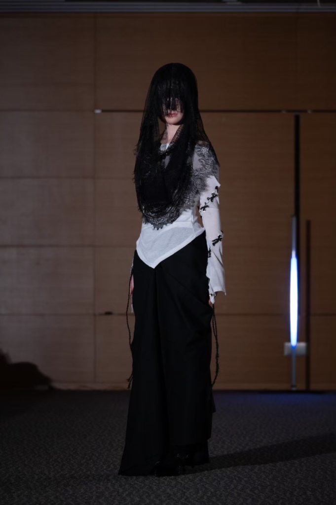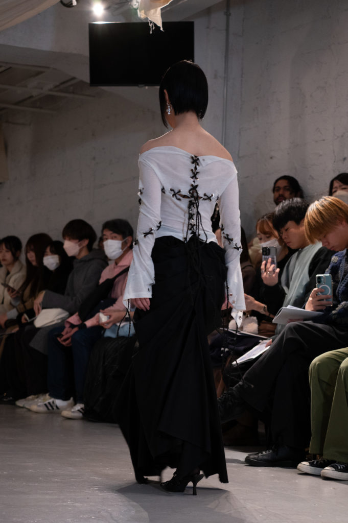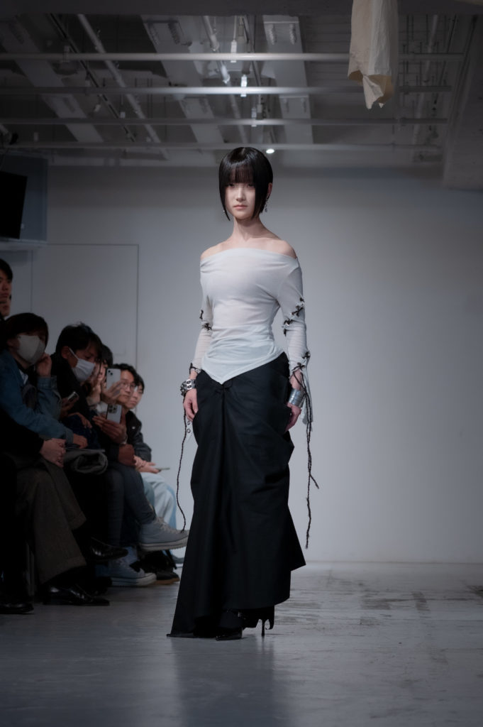 葛西:私の場合は自分の持っている服を上下どっちも使ったので、自分の服でどれだけショーのコンセプトに近づけられるかというのをやっていて、螺旋のモチーフを散りばめたり、ドレーピングもめぐっていくドレープをコンセプトでやったりしながら自分の中で解釈して作りました。ファーストルックに選ばれたのもコンセプトへの忠実さが出たのかなと思います。