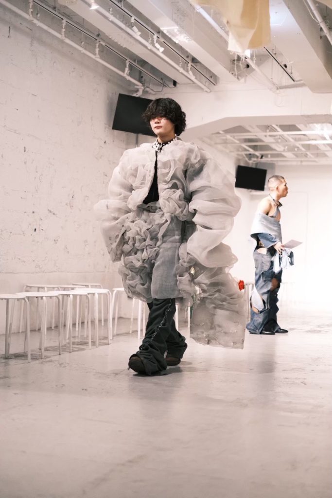 池田:みんなで決めた「めぐる」というタイトルは「未完成の完成形」というコンセプトと、「生と死」という概念が合わさって生まれました。私たちは基本的に古着を譲っていただき、それをリメイクすることでルックを製作しています。このような経緯から生産から着用、そして役目を終えて廃棄または再利用となる、服の循環について身近に感じていたことが着想元になっています。既製服として形になっているものをショールックとして別の形に生まれ変わらせることができると考えました。また、ファッションに限らず創作活動全般を大事にしている私たちだからこそ、一度完成した作品でも時間経過によって ”まだ手を加えれることができたな” ”あのときはまだまだだったな”と思うことが多々あります。創作活動への向き合い方が、私たち自身と重なっていると感じるようになりました。昨今は完璧な結果を重視する傾向がありますが、学生という発展途上の私たちだからこそ、完璧な結果である「完成」を追い求めながらそこに至る過程を大切にしたいと考えます。