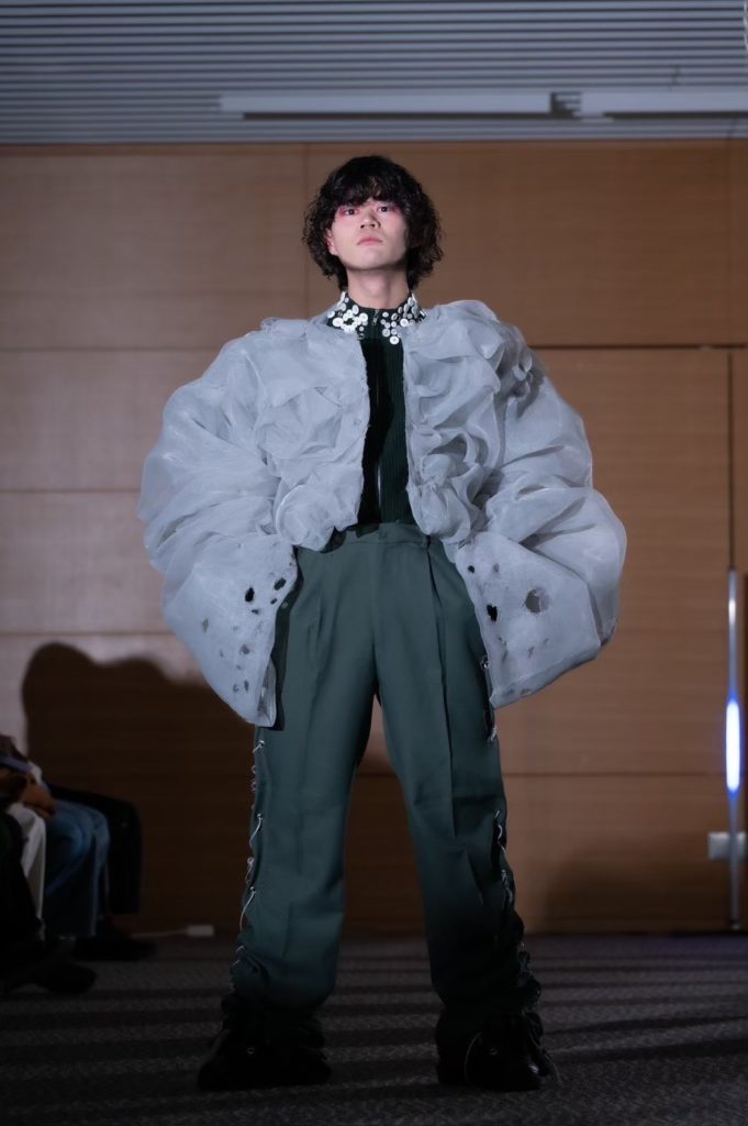 金井:今回のルックのイメージは「幼少期」です。制作には、着なくなった服や家にある使わなくなったものを使いました。これまで服を作った経験がなく、唯一、こどもの日に新聞紙で作った鎧だけが服作りに関する思い出でした。その思い出を「めぐる」と重ねて踏襲し、布ではない素材を使い、服の上から被るような形のものを作ろうと考えました。なので、縫製というよりも工作に近い感覚で制作しました。象徴的なものとして、父のタバコで穴が空いた網戸というインスピレーションの元、糸は使わず火を使って加工しました。網戸は風通しがよいのに、しっかりと張りがあるところが気に入っていて、その硬さの中に柔らかさを感じさせたいと思いました。また、丈の長いスラックスをあえてたるませ、ブーツを履くことで、少し背伸びをして服を着ているような幼い感覚を表現しています。装飾としては、飾りボタンを多く付けたり、好きな色である緑を基調にしたり、螺旋状の電話線をつけてみたりしました。分かりやすくて、どこかおもしろいものを目指すことで、子供の頃から変わらない自分なりの死生観を表現しました。